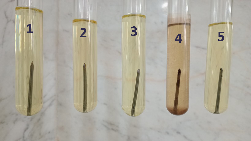 - لوله آزمایش شماره 1 : محتوی بنزین معمولی بدون تغییرات. - لوله آزمایش شماره 2 : محتوی مکمل سوخت Z4 تولیدی شرکت توسعه و فناوری کربن شیمی هونامیک با نسبت یک درصد، بدون تغییرات. - لوله آزمایش شماره 3 : محتوی مکمل سوخت Z4, Turbo تولیدی شرکت توسعه و فناوری کربن شیمی هونامیک با نسبت یک درصد، بدون تغییرات. - لوله آزمایش شماره 4 : محتوی مکمل سوخت یک شرکت تولید کننده داخلی با نسبت یک درصد و مشاهده اکسید آهن (تصویر سمت چپ با بزرگنمایی بیشتر). - لوله آزمایش شماره 5 : محتوی مکمل سوخت یک شرکت تولید کننده داخلی با نسبت یک درصد و مشاهده اکسید آهن.